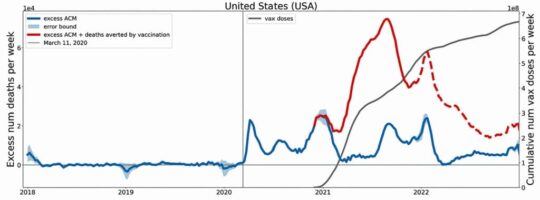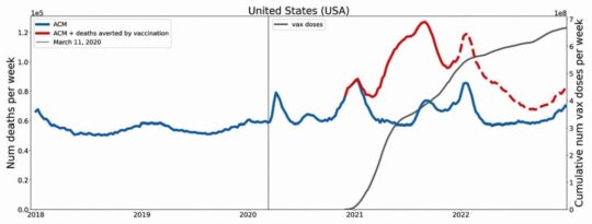If their numbers are correct, the graph shows, a “massive and more-than-unprecedented” national excess mortality would have occurred if the COVID-19 vaccines had not been rolled out, and that spike would have coincidentally happened at precisely the moment when the rollout happened to occur, but not before.