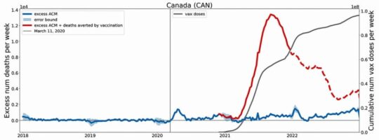 In Canada, there is also “no visible decrease in actual all-cause mortality” temporally associated with the roll-outs, which one might expect if the roll-outs affected mortality. Rather, they wrote, “the opposite is apparent, with excess mortality proportionately accompanying rollouts.”